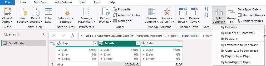 - Purpose & Result: Easily split a single text column into multiple columns (or rows) based on a delimiter or a fixed width. This helps you separate composite data – for example, splitting a full name into first and last name, or breaking an “AccountCode-Region” string into two fields. Power Query will create new columns for each part, removing the delimiter and assigning each part to its own column(radacad.com). It’s like cutting a sandwich into halves or quarters so each ingredient gets its own slice.