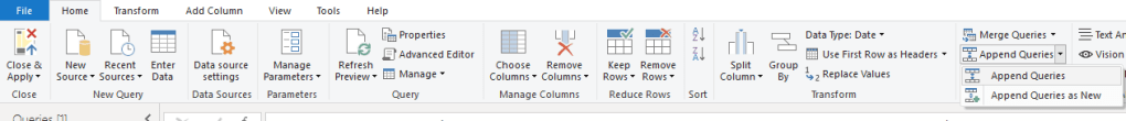 - Example: Suppose you track sales in separate tables by quarter (Q1, Q2, etc.). Rather than building separate visuals for each, you can append these queries into one master SalesAllYear query. In Power Query, use Append Queries -> Append as New, and select all four quarterly queries. The result is one table with all the rows from Q1, then Q2, Q3, Q4 stacked. If Q1 had 100 rows and Q2 had 150 rows, the appended table will have 250 rows, and so on(geeksforgeeks.org). Now you can feed this consolidated data to Power BI to easily analyze the whole year. [Insert screenshot of the Append dialog selecting multiple quarterly tables]